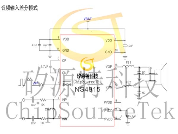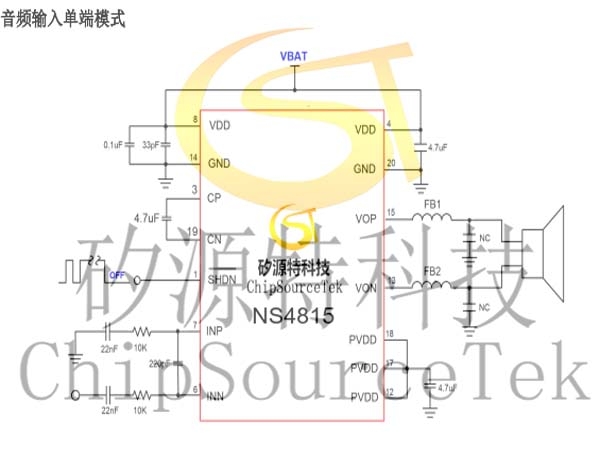NS4815采用一线脉冲方式控制四个工作状态,实现不同增益和NCN模式的选择。完善的保护功能有效防止芯片在异常工作状况下损坏。只需极少量的外围应用元件,适合便携产品应用。