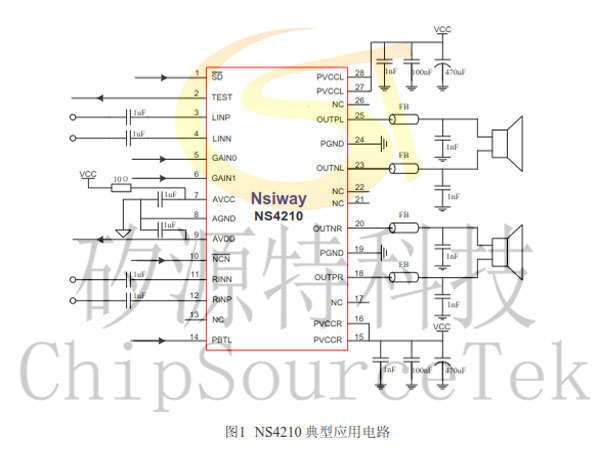 NS4210 是一款超低 EMI,无需滤波器,每声道可输出 10W 的 D 类立体声音频功率放大器。