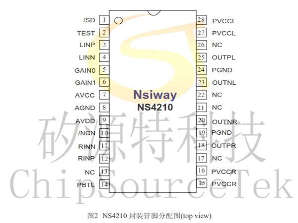NS4210 提供 TSSOP-28 封装,额定的工作温度范围为-40℃至 85℃。