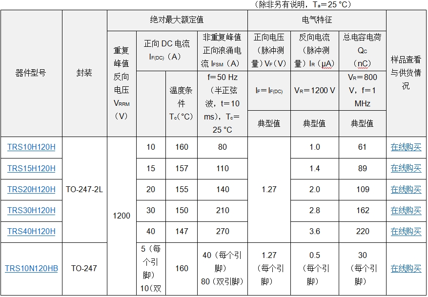 最新TRSxxx120Hxx系列为1200 V产品,其采用东芝第3代650 V SiC SBD的改进型结势垒肖特基(JBS)结构[1]。在结势垒中使用新型金属,有助于这些新产品实现业界领先的[2]1.27 V(典型值)低正向电压、低总电容电荷和低反向电流。这可显著降低较大电源应用中的设备功耗。