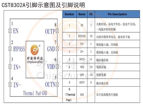 CST8302A is a 6.23W monaural audio power amplifier with FM interference free, four anti distortion AB/D switchable, high efficiency, and no filters. The ultra-low EMI is very suitable for use in portable devices with FM function.