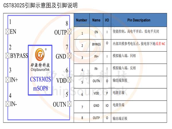 CST8302S is a 3.3W single channel Class D audio amplifier.