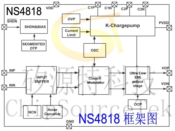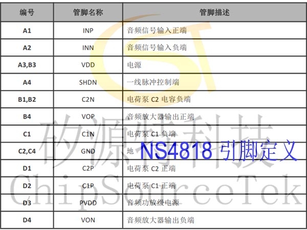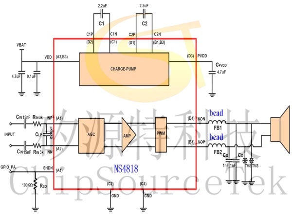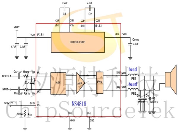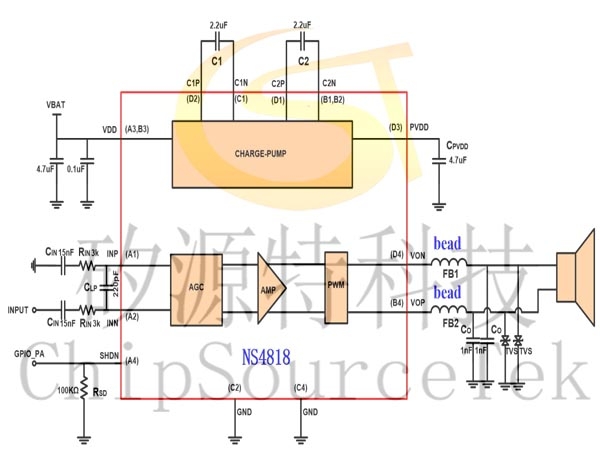 NS4818 是一款集成了电荷泵转换器的高效 G 类音频功放。