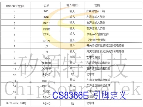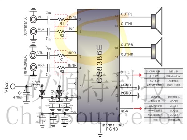 CS8386E是一款内置BOOST升压模块带4种,AB/D切换功能,恒定2*4W输出功率 R类音频功率放大器. BOOST升压至5.6V可以为4Ω的负载提供2X4.0W的恒定功率.CS8386E在锂电池的供电电压范围内提供了极致的功率输出,使得CS8386E成为便携式音箱设备特剧是扩音器产品的最优选择。