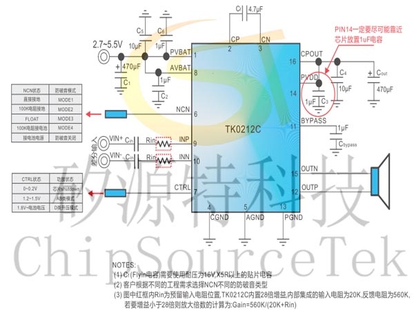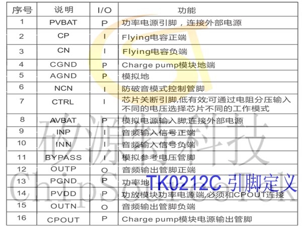 TK0212是一款采用CMOS工艺 ,电容式升压型GF类单 声道音频功放,可以为4Ω的负载供最高4.8W的连续功率的音频功放;TK0212芯片内部固定的28倍增益,有效的减少了 外围元器件的数量;功放集成了D类和AB类两种工作模式 即可保证D类模式下强劲的功率输出,又可兼顾系统在有 FM的情况下,消除功放对系统的干扰;TK0212具有独 特的防破音(NCN)功 能,可根据输出信号的大小自动调整 功放的增益,实现更 舒适的昕觉感受,其4种防破音模式 的选择为不同的工程要求O供了最大的挑选余地 ;另 外,TK0212还具备电源自适应能力,当电源电压低的时 候,功放会自动降低增益,从而减少功放的输出功率.