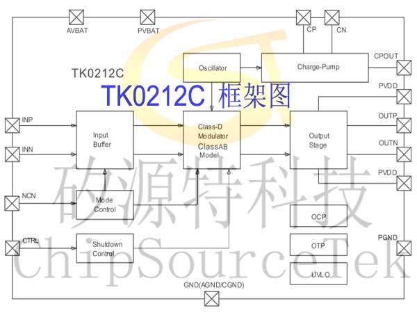 集成Charge Pump升压模块,集成AB类D类两种工作模式GF类音频功放