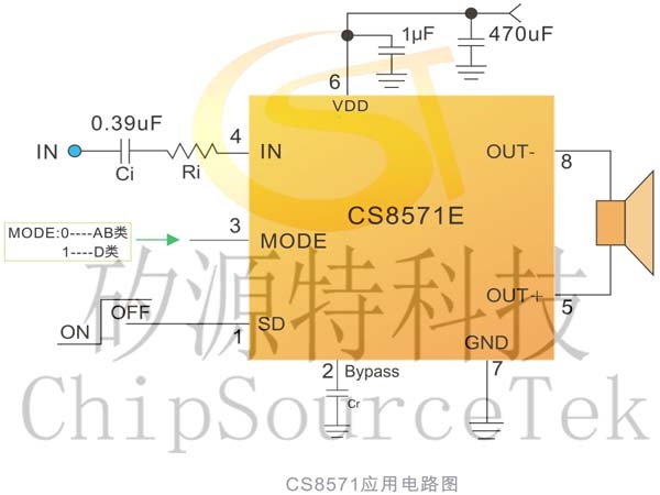 CS8571E是一款FM无干扰、AB类功放D类功放两种模式可切换的5.5W单声道音频放大器。