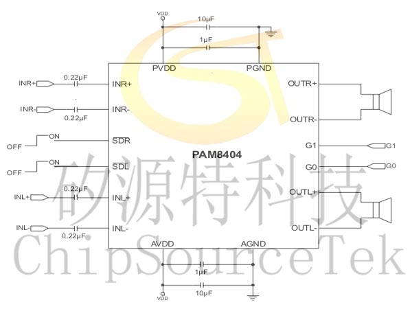 In cellular handsets, the earpiece, speaker phone,and melody ringer can each be driven by the PAM8404.The allows independent gain by summing signals from seperate sources, and