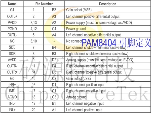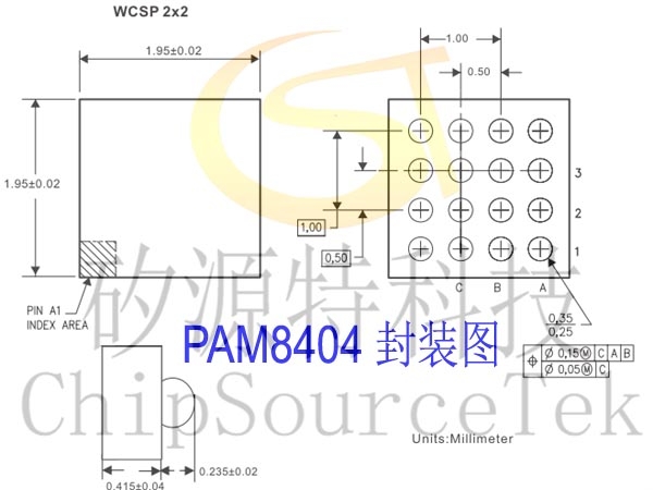 The PAM8404 is a 3W high efficiency filterless class-D audio amplifier in 4mmX4mm and 2mmX2mm wafer chip scale packages that requires few external components.
