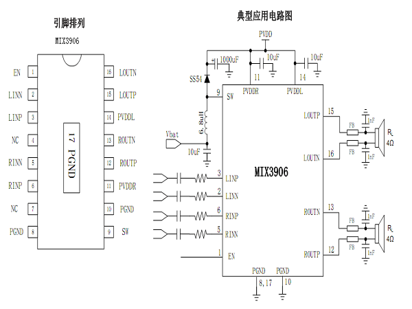 MIX3906是一款内置升压功能的高效率、无滤波器双通道带防破音功能F类音频功率放大器、