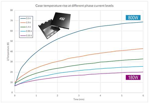 该GaN开关管可以安全地输出约 800 W 的功率,而不会发生热失控。温升 Δt 小于 70 °C,在达到 150 °C 的最高工作结温 (TJmax)之前,有充足的安全裕量。