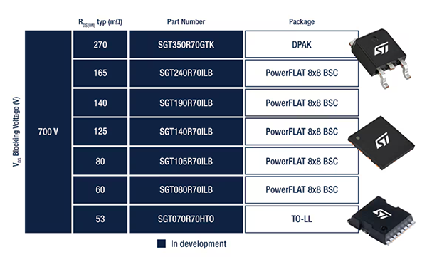 STPOWER GaN晶体管本质上是常关型p-GaN栅极增强模式晶体管,零反向恢复电荷。STPOWER GaN 700 V额定击穿电压 (VDS)晶体管目前总共有七款产品,典型导通电阻RDS(on)范围270 mΩ到53 mΩ,采用DPAK、PowerFLAT 8x8和TO-LL封装。