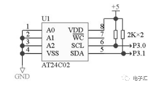 电路连接如图5,其中A0,A1,A2为地址线,本例中全部接地,因此全部为0。由于SCL和SDA为漏极开路输出,所以在使用时,需加上拉电阻。