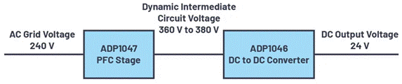 用于功率补偿的功率因数校正(PFC)级,可将电网电压的交流电压提升至直流中间电路电压。在240 V交流系统中,这种中间电路电压一般为380 V,如图1所示。ADP1047 PFC控制器可以使用DVS,在不影响设定的380 V电压的情况下独立降低输出电压负载,例如,降低至360 V。在采用部分负载运行期间,此举可以提高电源的转换效率。