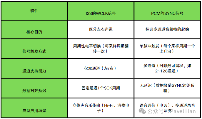从以上PCM接口所包含的数据线可以看到,PCM_CLK、PCM_DIN、PCM_DOUT的定义与I2S没有区别,双方之间的区别主要是在I2S的WCLK和PCM的PCM_SYNC上。