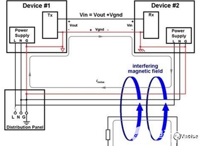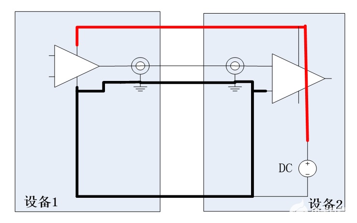 如上图,设备一和设备2都有自己的独立供电系统,本来Device1和Device之间只有屏蔽线互相接GND,但是因为都接到了220V电源,所有又构成了如上图红色的地环路。